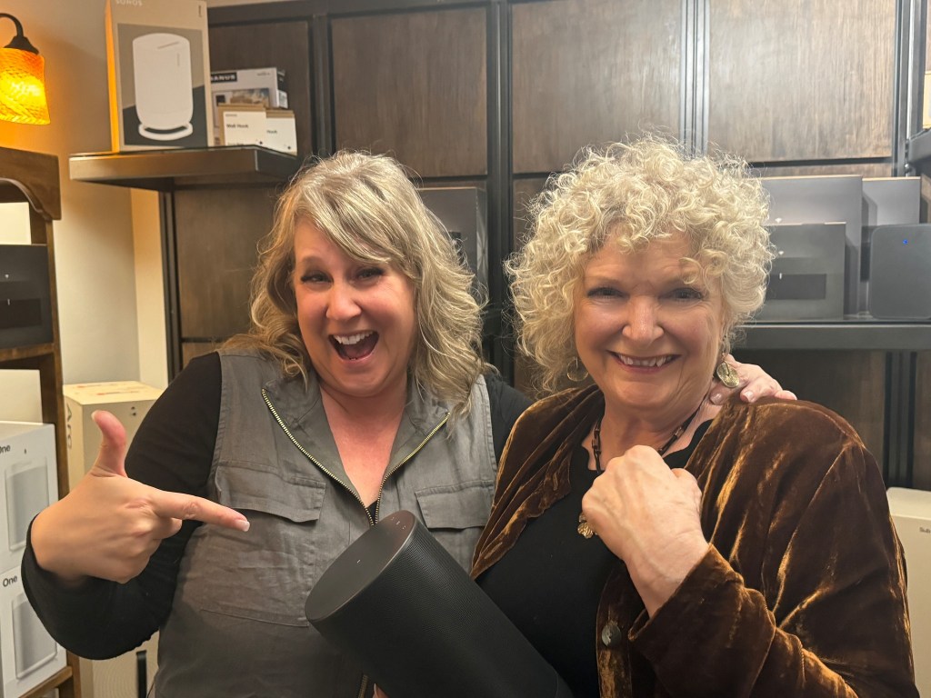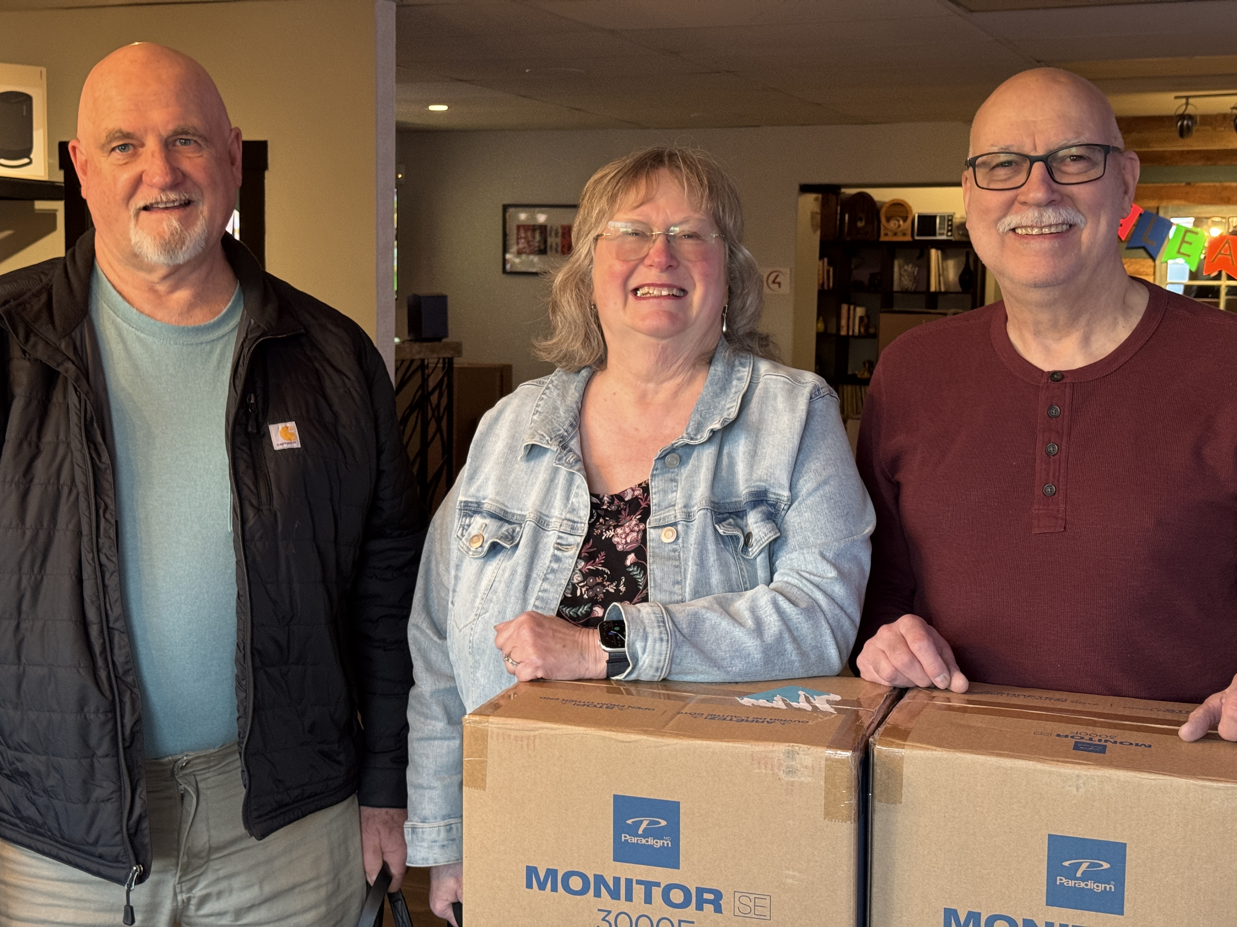 Longtime customer Colleen Forshaw was thrilled to win a pair of Paradigm loudspeakers.